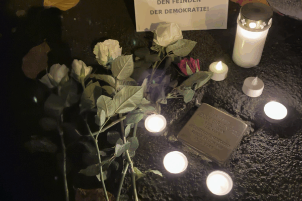 Am 9. November, Jahrestag der Pogrome gegen Jüdinnen und Juden wurde vom AKU ein Stolperstein-Mahngang im Rheingauviertel und ein Gedenken am Mahnmal der deportierten und ermordeten Sinti und Roma organisiert. Gekommen waren ca. 40 Menschen, die gemeinsam ihre Anteilnahme ausdrückten und sich gegen das Vergessen